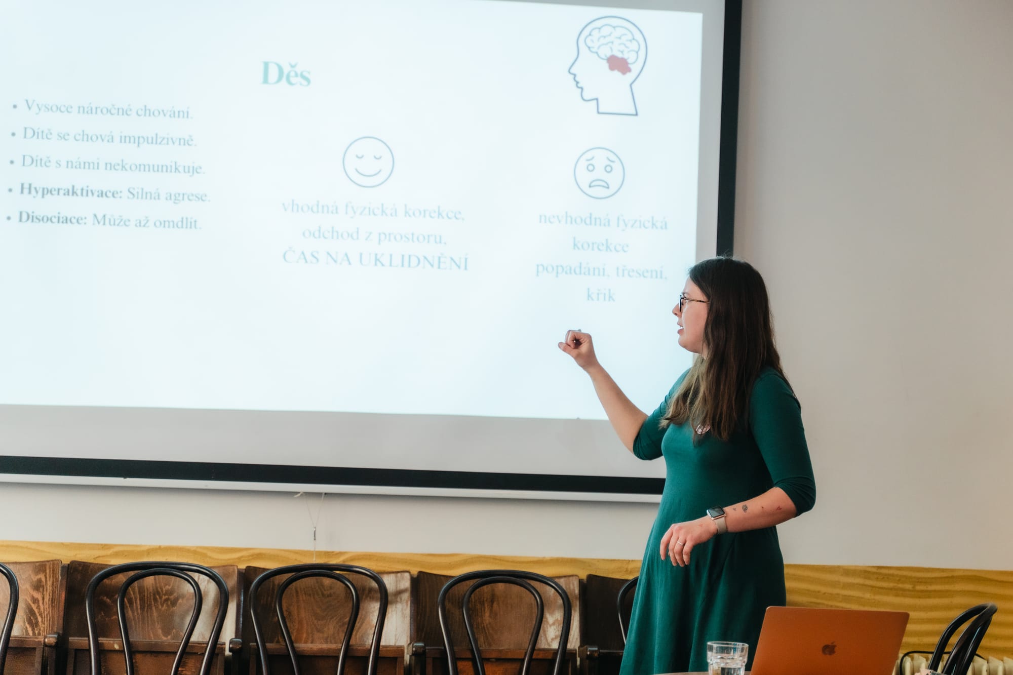 Hlavním bodem dopoledne byla přednáška naší víly Terky, která studuje speciální pedagogiku a pracuje s náročnými dětmi. Mluvila o tom, jak děti prožívají stres, co se v takových chvílích děje v jejich hlavách a jak na to můžeme jako dospělí reagovat – kdy je lepší být s dítětem, kdy raději ustoupit, a co může pomoct v krizových situacích. Terka vycházela ze své praxe a přednáška byla opravdu nabitá informacemi, ale zároveň srozumitelná a použitelná v každodenní realitě.